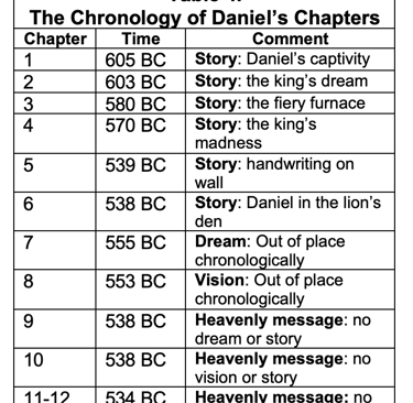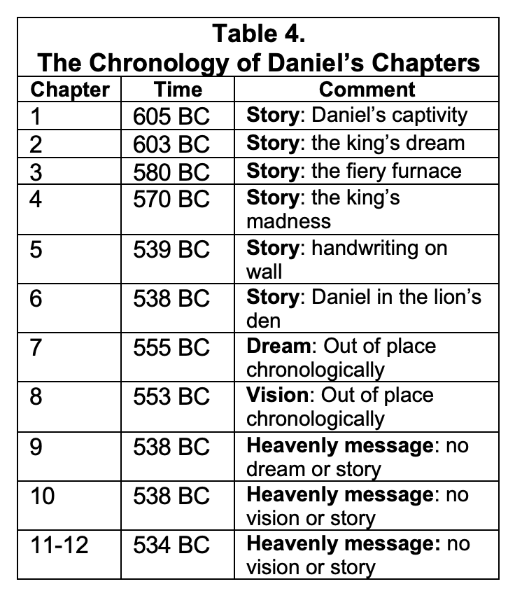 Table 4 somewhere on this page lists the chapters of Daniel and the time frame in which they took place: